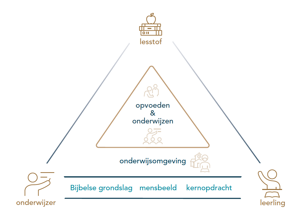 Het model van Bijbels Onderwijzen is ontleend aan de pedagogische driehoek van J.D. Imelman. We kozen ervoor om de driehoek om te draaien zodat er een basis ontstaat waarbij de Bijbelse grondslag, het mensbeeld en de kernopdracht in de driehoek zijn geplaatst. Dit is het fundament onder opvoeden en onderwijzen.